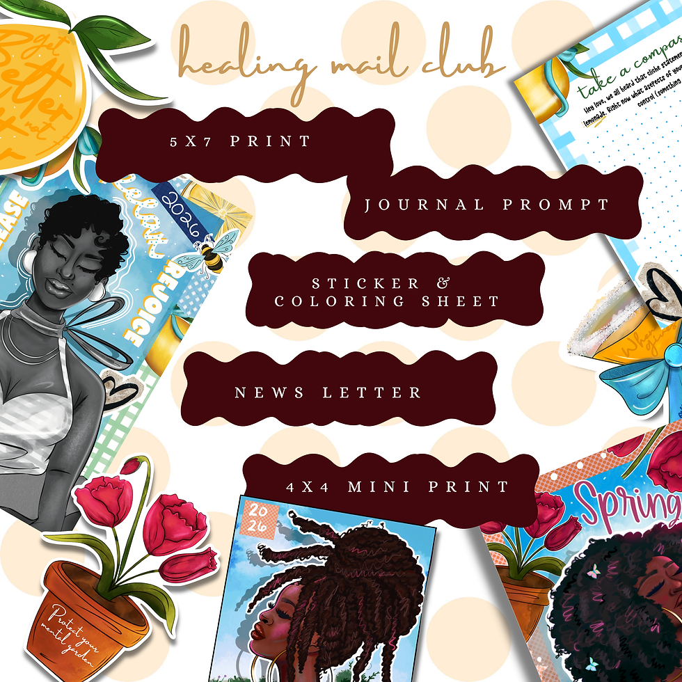 I wanted to start a mail club because healing deserves to feel beautiful. Because Black art deserves to be held, collected, and cherished. Because sometimes the smallest things, a print, a letter, a moment of softness can shift your whole day.